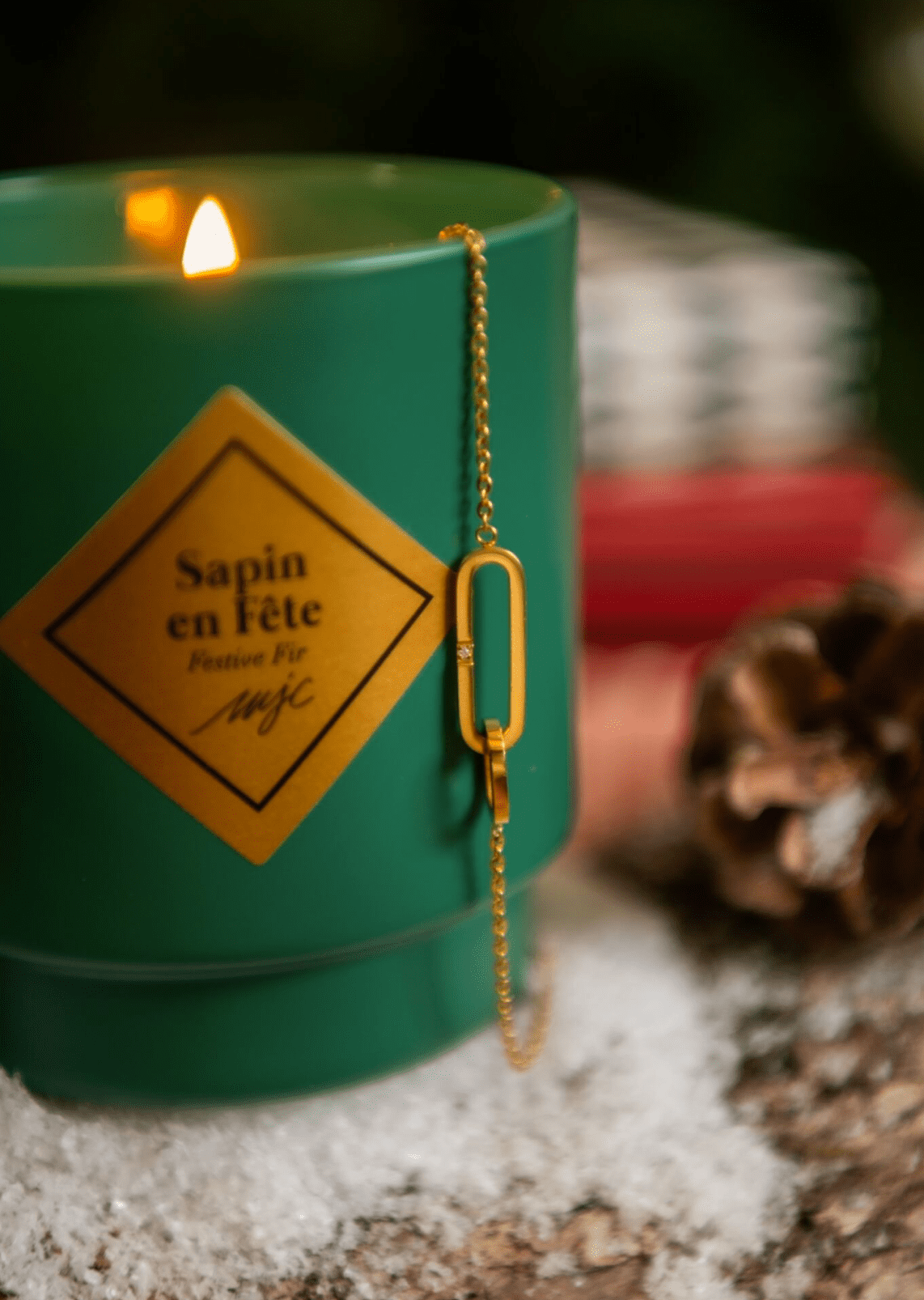 Laissez-vous séduire par notre somptueuse Bougie Bijou Sapin en Fête, une création unique de My Jolie Candle qui incarne l'esprit de la saison avec une touche de luxe. Découvrez un superbe bracelet doré à l'or fin, et son cristal de Swarovski.