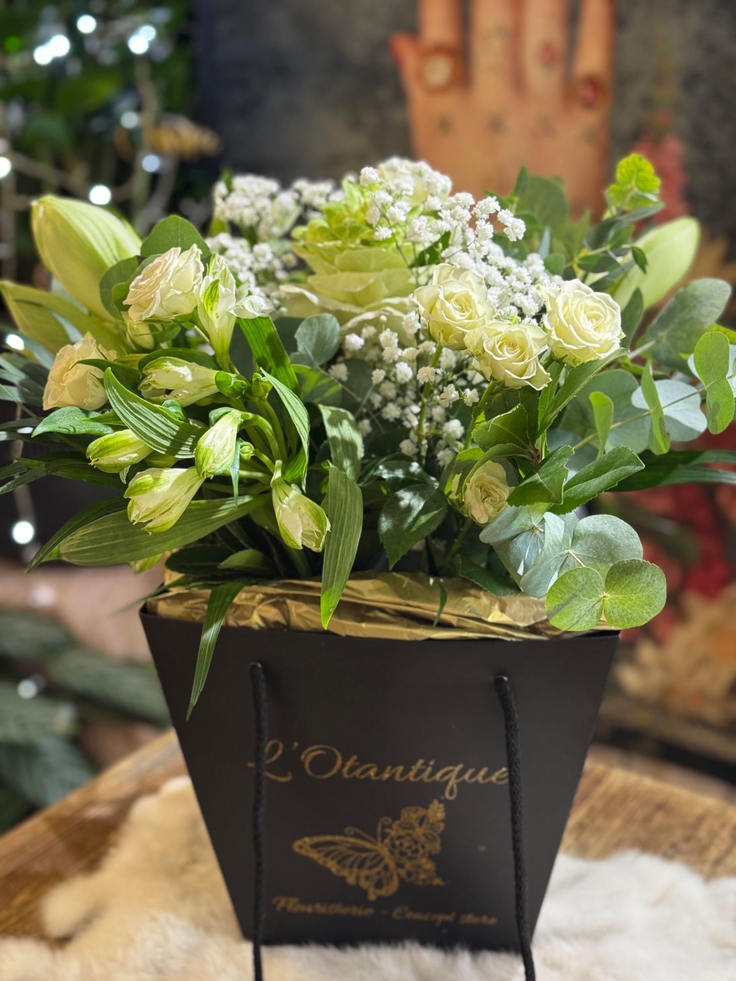 A l'occasion des Fêtes de fin d'année nous vous proposons notre nouveau concept, un superbe bouquet composé de fleurs de saison qui se décline en plusieurs tailles et couleurs mais toujours dans son sac noir et doré signé L'OTANTIQUE.