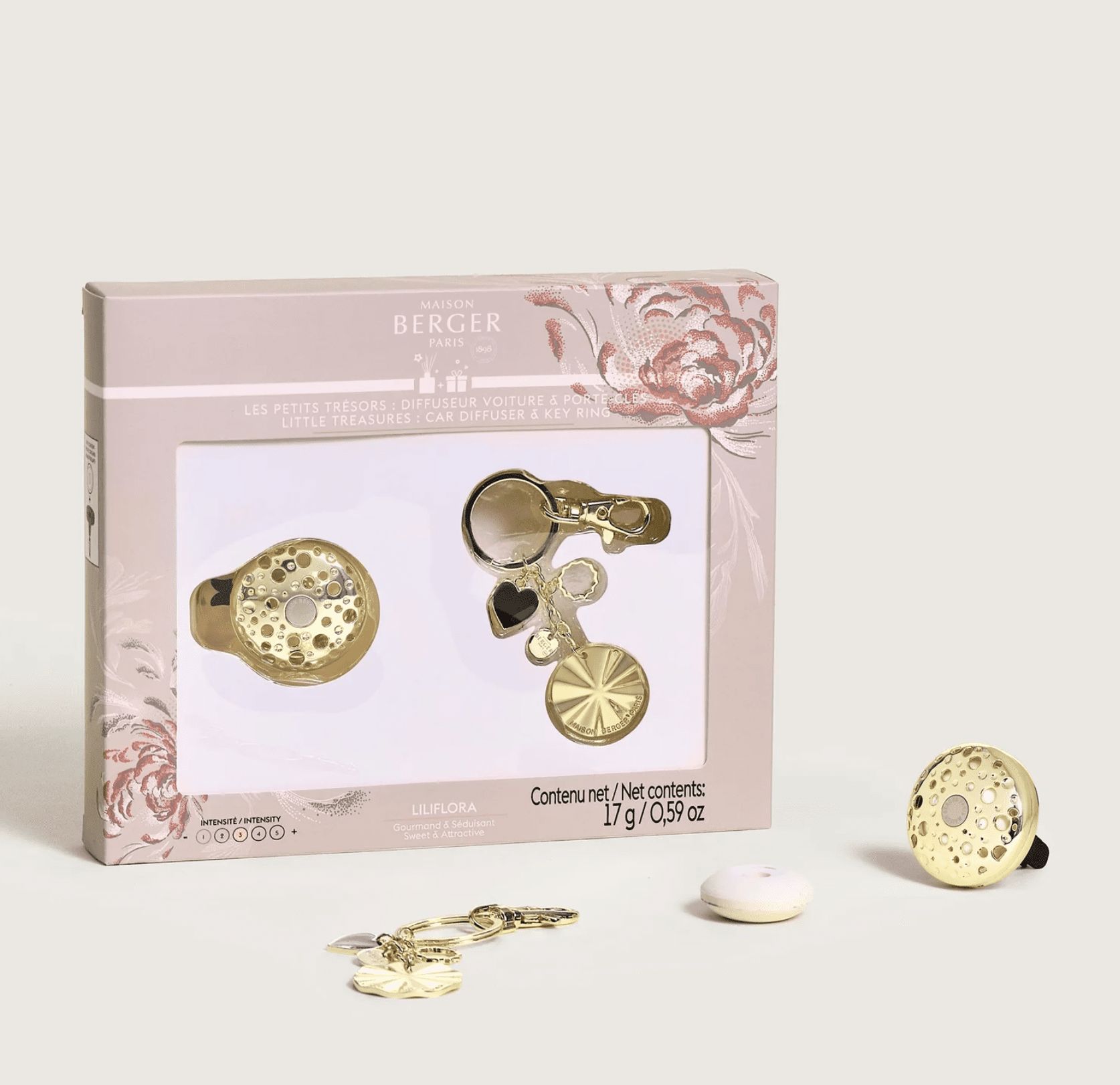 Sublimez vos trajets avec le coffret Les Petits Trésors Ophelia Or, réunissant diffuseur voiture, porte-clés et la délicatesse du parfum Liliflora.